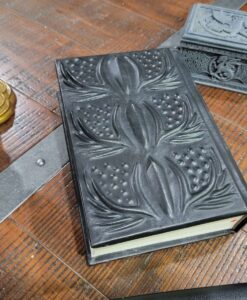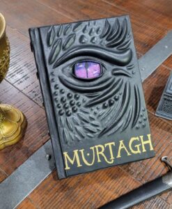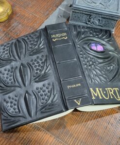 This listing is for a made-to-order black leather bound (dragonhide!) rebinding of the 2023 hardcover edition of Murtagh, with a majestic dragon eye on the cover and ridges of dragon spines on the surface. This leather bound tome of Murtagh is approximately 9.2 x 6.3 x 1.98″ inches and weighs 2.2 lbs. The unique embossed cover makes for a wonderful addition to any library or collection. Additionally, custom commissions are available — if one desires the complete Inheritance Cycle.