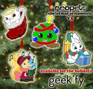 It’s the Month of Celebrating in Neopia! Introducing our third set of Christmas ornaments to add a little bit of Neopets flair to your holiday festivities. Hang a be-stocking’d Angelpuss by the chimney with care, get tangled up in Christmas lights with a Jubjub, deck the halls with a caroling Usul, or try your hand at wrapping some presents with a Christmas Cybunny. Get all four for a Complete Set! Measuring 3.5″ inches in diameter, made of metal and soft enamel colors, each has a ribbon attachment, making these adorable Neopets ornaments are both durable and timeless for Christmas for years to come.