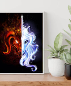 This poster of the side by side portraits of the Red Bull and the Unicorn from the animated movie version of Peter S. Beagle’s The Last Unicorn is 18 x 24″ and is a beautiful addition to any wall or room. The ferocity of the Red Bull contrasts with the gentle but fierce strength and beauty of the Unicorn. Get one for your collection today!