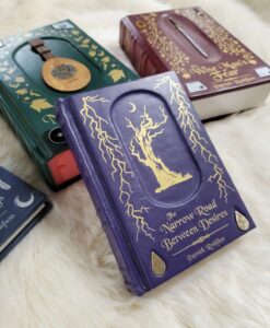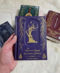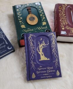 Featuring a leatherbound rebinding of a hardcover edition of The Narrow Road Between Desires by Patrick Rothfuss, this is a novella retelling of The Lightning Tree short story adjacent to the Kingkiller chronicles. Bound in a buttery purple leather with gold lightning and tree designs and set with brass medallions reminiscent of Tehlin penance pieces, this tome measures approximately 7.95 x 7.2 x 0.94 inches and weighs 1 lbs. Our uniquely designed cover makes for a wonderful addition to any library or collection, and pair marvelously with the rest of the Kingkiller Chronicle rebinds of The Name of the Wind, The Wise Man’s Fear, and the Slow Regard of Silent Things.