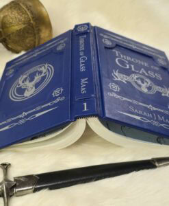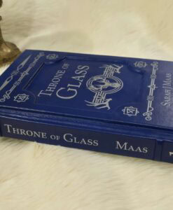 Featuring a leatherbound rebinding of a hardcover edition of the first Throne of Glass books by Sarah J Maas, this story starts off the critically acclaimed and fan-revered Throne of Glass series. Bound in blue leather with silver trim and stag, this tome measures approximately 9.5 x 6.5 x 1.25″ inches and weighs 1.7 lbs. Our uniquely designed cover makes for a wonderful addition to any library or collection, and the rest of the series is available upon request.